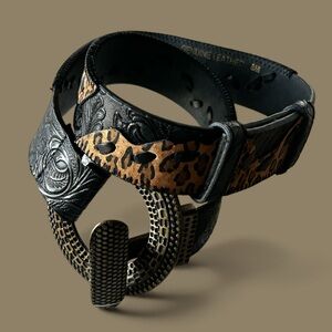 Genuine leather belt with calf hair leopard print inlay and a black tooled embossed section. Western-inspired design with a large rustic hammered metal buckle