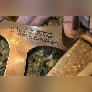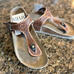 Elegant tan leather sandals with intricate embossing. Comfortable and stylish for everyday wear. Size 11, New With Tags
