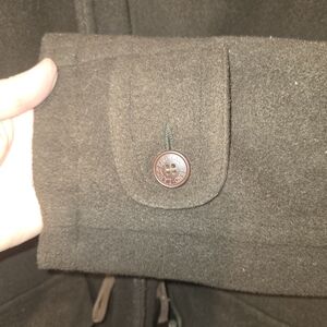 Full zip with suede patch toggle closure, drawstring hood, 80% wool 20% nylon shell, 100% wool lining, polyester insulation .