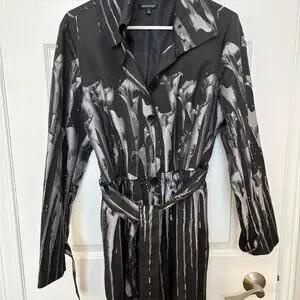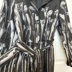Stylish trench coat with an artistic black and gray pattern. Features a belted waist and button closure.