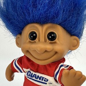 The product is a vintage Russ Troll Doll with dark blue hair, representing the New York Giants football team in a Heisman pose. This 4-inch doll is made of plastic and is part of the Russ Trolls franchise. It includes clothes and has a sport theme, perfect for football season. The doll has a medium complexion, blue eyes, and straight hair, reflecting its vintage design from the 1990s. Ideal for collectors of vintage dolls and fans of the NFL team, this original Troll Doll by Russ is a nostalgic piece of sports memorabilia.