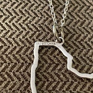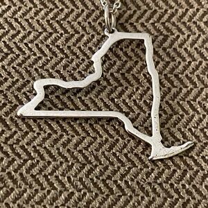 This sterling silver necklace is the cutout border outline of the star of New York. The claw clasp is engraved “QV 925 Italy” on both sides. The pendant is engraved “PAJ 925 China” on the back. The pendant border has some areas of scratching, and the whole necklace has some general oxidized tarnishing throughout but can be polished. The chain measures 18” in total length. The New York pendant measures 1” by 1”.