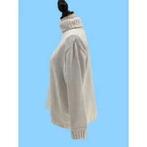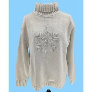 This sweater combines a timeless turtleneck style with an intricate snowflake knit design. The soft ivory tone complements the sophisticated, cozy look.