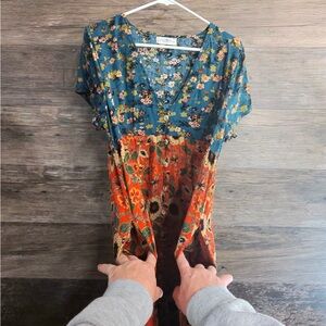Charming floral maxi dress with a V-neck design. Features a vibrant mix of blue and orange. Perfect for casual outings.