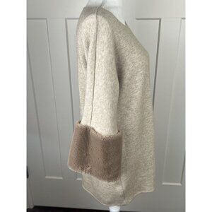 Fabulous Joseph Ribkoff women's designer tunic length sweater. Taupe/beige with 7" deep very soft faux fur accent on 3/4 length sleeves. So classic!