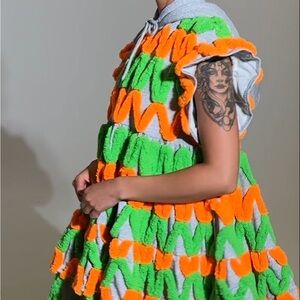 Vibrant mini dress with bold green and orange zigzag pattern. Sleeveless design. Perfect for a standout look.
