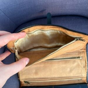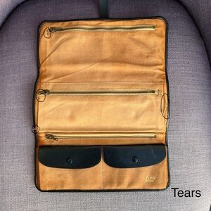 Vintage with signs of wear! Can be used like jewelry case or bag (clutch). Canvas is vibrant and clean, there is some rubbing on the leather. There are several tears inside. All zippers work