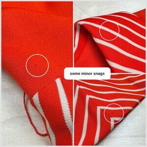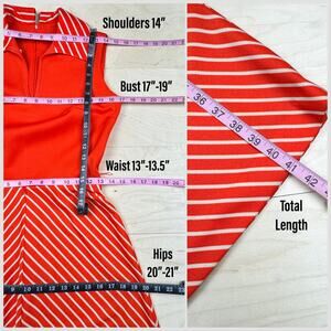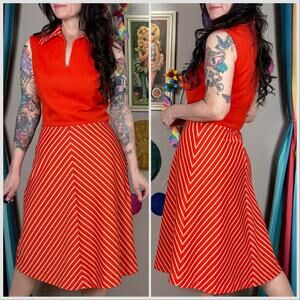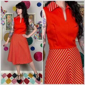 What a cute little 70s dress! Featuring a sleeveless bodice with a split neckline and large fold over collar, fitted waist and paneled a-line skirt. Does have belt loops but no belt. Back zipper closure. Made from a thicker polyester knit material and comes in a red orange color with beige stripes.