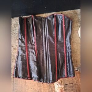 This stylish black and red corset is perfect for any occasion. Its elegant design adds a touch of sophistication to your wardrobe. missing ribbon for back tie.