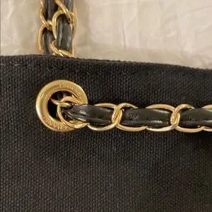 Sophisticated Chanel tote with iconic logo. Features elegant gold chain handles. Ideal for chic outings.