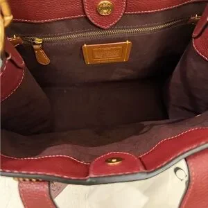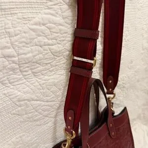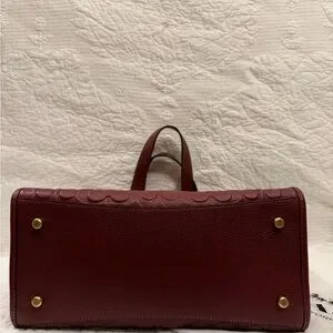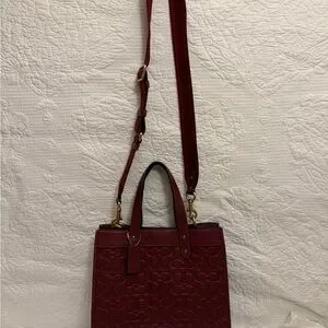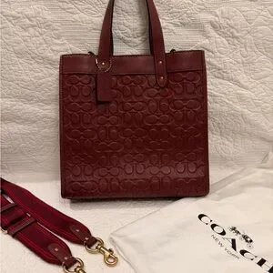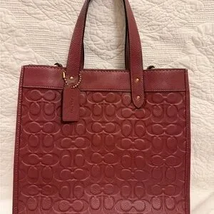 Elegant rich wine color Coach tote. Features embossed signature pattern. Sturdy leather handles and detachable strap. Gorgeous bag!