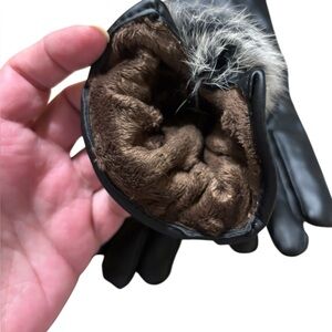 These elegant black faux leather gloves feature a stylish fur accent, perfect for adding a touch of sophistication to any outfit. Ideal for keeping warm while looking chic.