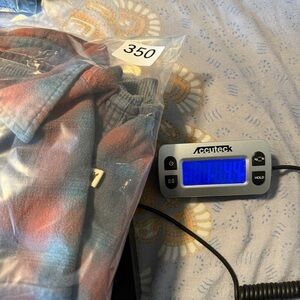 Good preowned condition one tiny possible bleach spot near bottom of shirt near snap — see photo. Some wear to shacket no holes. Very soft and comfortable.