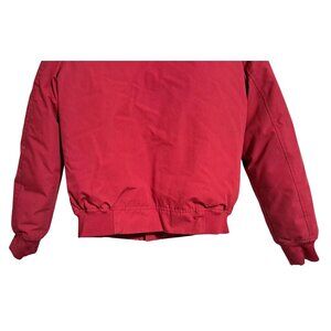 This bomber jacket features a sleek design with button and zipper closure, offering style and functionality. Its red body and navy accents elevate its classic appeal. Minor wear. 60% duck down and other materials.