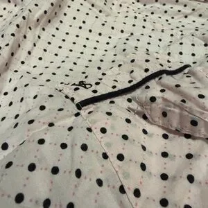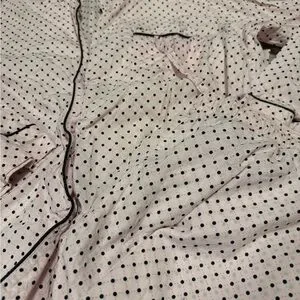 Stylish pink pajama set with polka dots. Comfortable and chic for lounging.