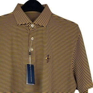 NEW Holderness & Bourne Maxwell polo shirt in a navy and yellow stripe pattern. Cool embroidery of a yellow jacket playing golf. This polo features a pique knit for superior breathability, a structured cutaway collar, and genuine shell buttons. The tailored fir DryLuxe performance poly blend ensures comfort and durability. Perfect for a round of golf, a casual weekend outing, or a relaxed business casual setting.
