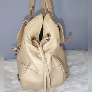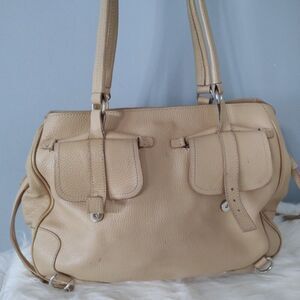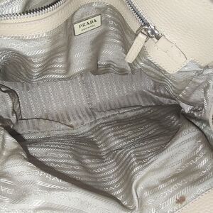 Gorgeous large leather Prada shoulder bag in neutral vitello Daino leather. Silvertone hardware, flat handles, logo jacquard lining.