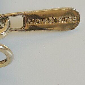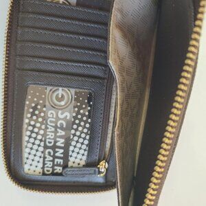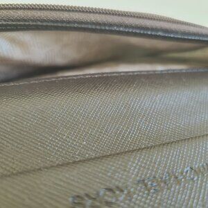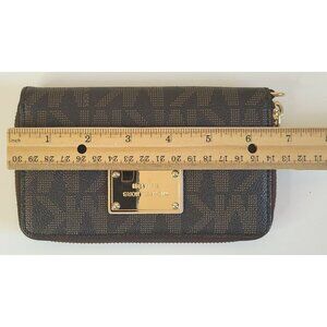 This stylish Michael Kors wallet features a classic brown and gold design with ample card slots and a secure zip closure. There are some signs of wear on zipper hardware, two faint scratches on Logo hardware. In very good condition. Wallet measures 6.5 inches by 4 inches.