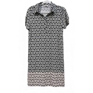 Embrace playful charm with this new Sophie Max shirt dress. A captivating floral pattern bursts with life against a classic black backdrop, fading into a delicate pink and white geometric hemline. The collared neckline and button-front design offer a touch of polished sophistication, while the short sleeves provide a breezy feel. Perfect for a casual brunch, a day at the office, or a relaxed weekend outing.