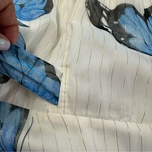 Elegant maxi dress with blue floral design. Wrap style with long sleeves. Perfect for special occasions.NOTE : Please see the video as you can see the gold stripes is faded to silver under the waist….Evoking glamour in a free-spirited look, this nature-inspired butterfly wings design mesmerizes with its flowy silhouette that creates a dramatic leg with every step. The shimmer details further accentuate the allure this luxe true wrap maxi dress.