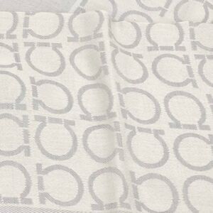 Authentic Salvatore Ferragamo large stole scarf featuring the iconic all-over Gancini pattern in a sophisticated light gray and ivory palette. Crafted in Italy from a soft, lightweight blend that drapes beautifully. Finished with subtle fringed edges for an elegant touch. Perfect as a wrap, shawl, or oversized scarf for year-round styling.