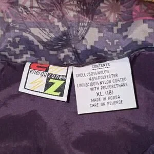 Step back into the late ’80s and early ’90s with this vibrant Energy Zone windbreaker jacket, made in Korea. Features a shiny purple nylon shell with silver and multicolor geometric floral accents, zip front closure, drawstring collar, and elastic cuffs and hem for that classic retro silhouette.