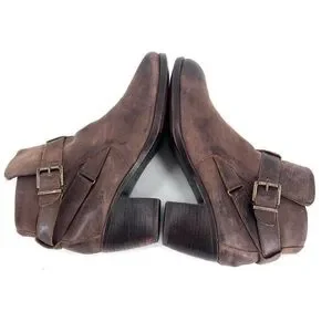 Chic distressed leather booties. Features buckle detail. Ideal for versatile styling.
