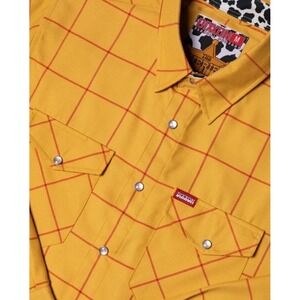 The product is a brand new in bag men's button-down shirt by Dixxon Flannel Co, featuring a yellow plaid design. It has a regular fit, long sleeves, and a snap closure. The shirt is made of flannel fabric and accented with buttons. It is in size XL, making it a great addition to any man's wardrobe for casual wear.