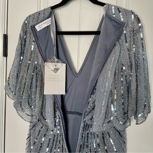 Mac Duggal 93583 Beaded Cape Sleeve Sequined Column Gown Slate Blue NWT Sz 8