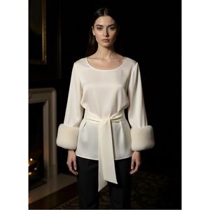 Elegant white top with long sleeves. Features a stylish belt and fur cuffs. Perfect for a chic look.