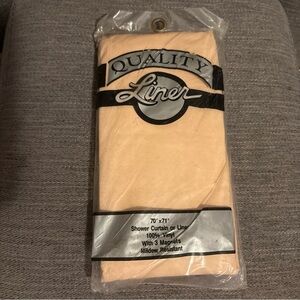 Vintage 100% vinyl shower curtain liner sized 70” x 71”, still in original sealed packaging. Features magnetic bottom to keep it in place and mildew resistant construction. Peach color gives a unique look compared to plain white liners. Made for Kmart (Quality Liner), unused, from smoke-free home. Some age spotting on packaging, liner inside remains pristine. Sold as shown.