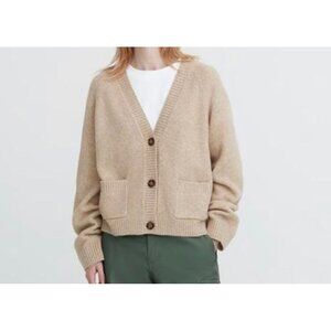 Elevate your style with this elegant beige cardigan, featuring a ribbed V-neck design and front button closure. Crafted from a cozy wool-acrylic blend, it offers long sleeves and convenient front pockets, perfect for layering in cooler weather. Very good used condition.