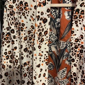 Bold orange kimono with striking leopard print. Ideal for layering.