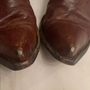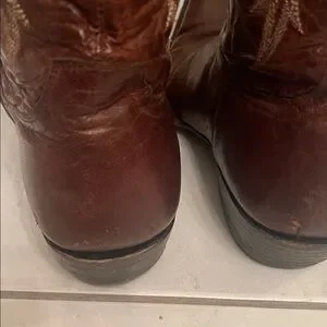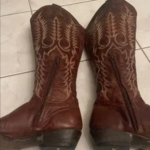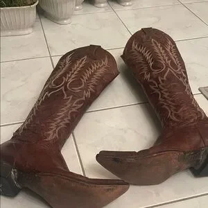 Tall Old Gringo brown heeled boots. Intricate gold stitching design. Perfect for a stylish look. The toe came with a rugged, skinned-toe look. Some nicks in the leather on the back heel, see the picture.