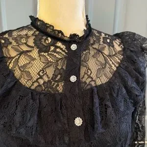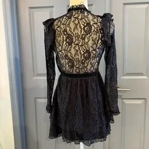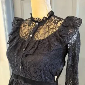 Chic black lace dress with ruffled neckline. Long sleeves and button details. Perfect for elegant occasions.