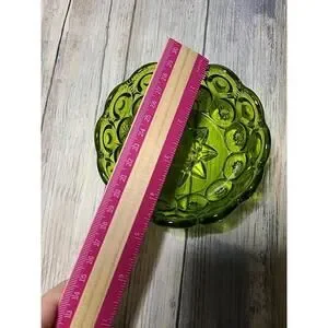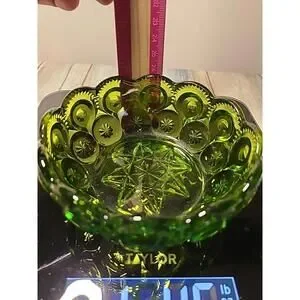 The Green L.E. Smith Moon and Stars Bowl is a vintage collectible made of glass with a round shape and a diameter of 4.5 inches. This decorative bowl features a classic moon and stars pattern in a vibrant green color. It is ideal for showcasing on a table or shelf, adding a touch of nostalgia and charm to any space. Perfect for collectors of vintage glassware or those looking to add a unique piece to their home decor.