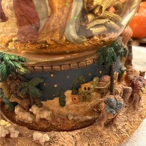 Beautiful nativity scene snow globe with intricate details. Features vibrant colors and a festive design.