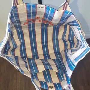 Stylish and spacious, the tote bag features vibrant blue and red stripes. Perfect for everyday use, shipping, groceries, errands and more.