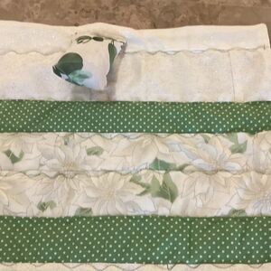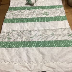 NWOT. Hand crafted from all new 100% cotton fabrics and made in a smoke free home. What dolly or stuffed animal wouldn’t like to have this snuggly green and white quilt and pillow? Showing photos of front and back sides. This one measures 20 1/2” X 12 1/2” and is made with the same detail as the real thing!