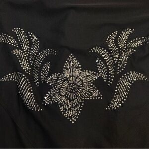 Chic black dress with eye-catching silver details. Asymmetrical design adds flair.