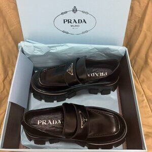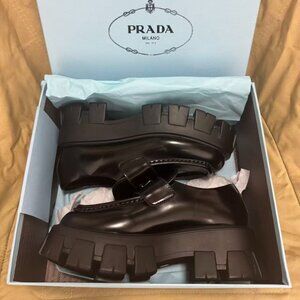 Elevate your footwear collection with these iconic Prada platform loafers. Crafted in sleek black patent leather, they feature the brand's signature triangle logo on the vamp and a bold chunky sole for modern edge.