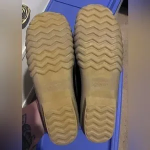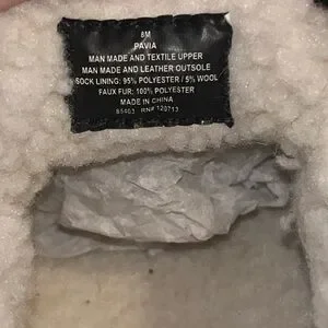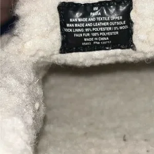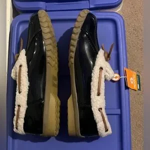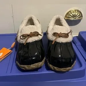 Black boots with cream shearling trim. Sporto branding on heel. The original sporto genuine duck short booties.