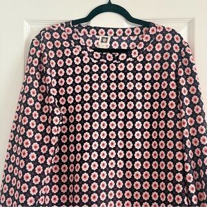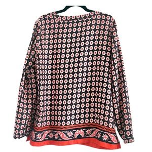 This Anne Klein blouse showcases a captivating geometric pattern in black, orange, and white, enhanced by a boxy silhouette. Crafted from lightweight fabric, it features long sleeves and a round neckline, making it ideal for both casual and business casual occasions. Hidden half zipper in front. A contrasting border in warm tones adds a sophisticated touch to this elegant top. 100% Polyester
