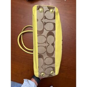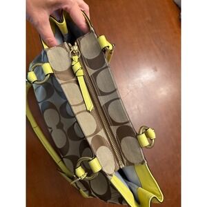 This Coach Park Khaki Signature Tote is a stylish and versatile bag perfect for any occasion. The exterior is made of durable canvas material with a khaki color, and features green leather trim. The tote comes with a green canvas handle/strap and gold hardware, giving it a unique and fashionable look. The interior is lined in gray fabric and appears unused. See one small faint spot in photo. Top zipper can detach to more fully open bag.
