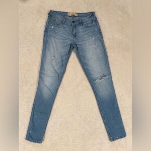 Cute and comfy Hollister skinny jeans in size 5R with classic distressing on the legs. Medium-wash denim with a flattering skinny fit. Pre-owned with bleach stains and general wear. Distressing is original to the jeans. Still a great everyday pair if you like distressed or DIY-bleach styles.