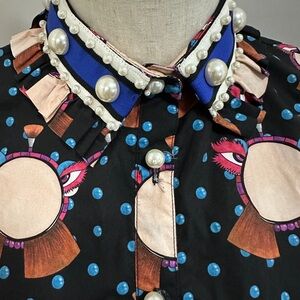 Stylish black button-up shirt featuring a vibrant and playful print. Perfect for adding a pop of color to your wardrobe.