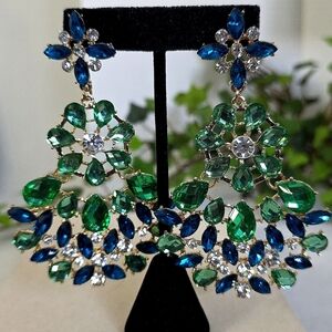 Large Statement Earrings Gold and Teal Blue with Green Chandalier