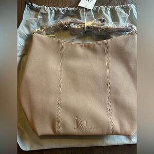 New with tags! Elegant suede hobo bag in a fawn color. Beautiful bag! Zipper pocket in front. The whole bag zippers closed. Inside there are two pockets and the other side has a zipper pocket. Comes with original bag. Make me an offer!