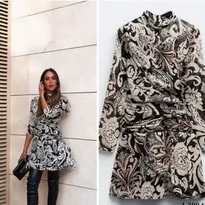 Zara Black and Cream Paisley Long Sleeve Dress