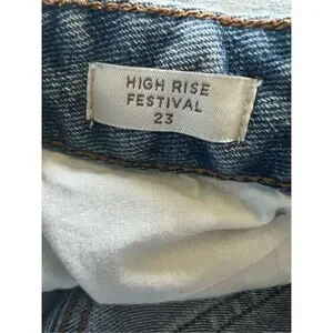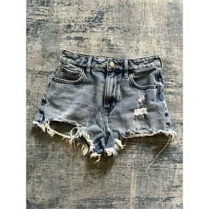 High rise festival denim shorts from PacSun. Whiskering, fading, raw cut off hems, rips, zip fly, and classic 5 pocket styling. Signature logo patch on back waistband.